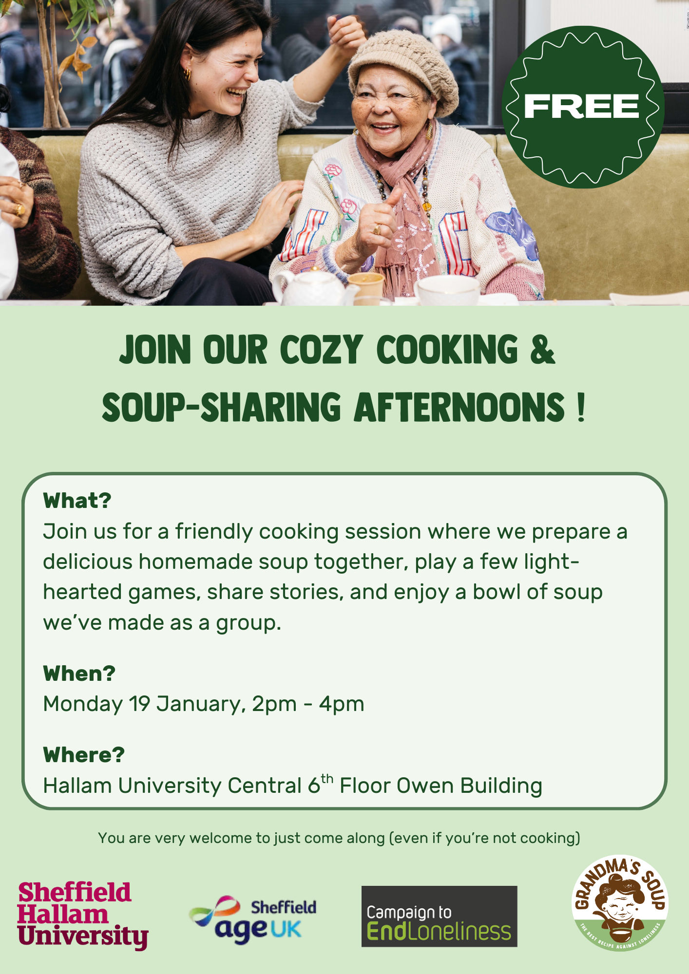 Grandma's Soup Cooking Days connect young volunteers and older adults for soup-making, games, and laughs, building community and fighting loneliness.